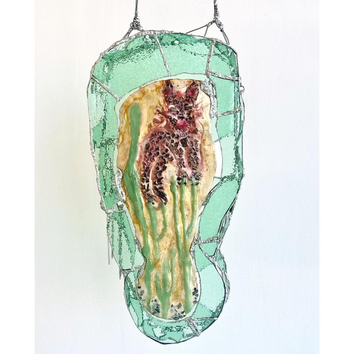 Stained glass, steel, aluminum, copper, pewter, bronze, patina, shells, moonstones, crystals, ceramic, lights, body wax, mica, electroplated copper, blown and flameworked glass, water, kelp, fish bait, cloves, star anise, quinoa, dill, poison seeds, paper pulp, spirulina, sand, turmeric, borax, salts